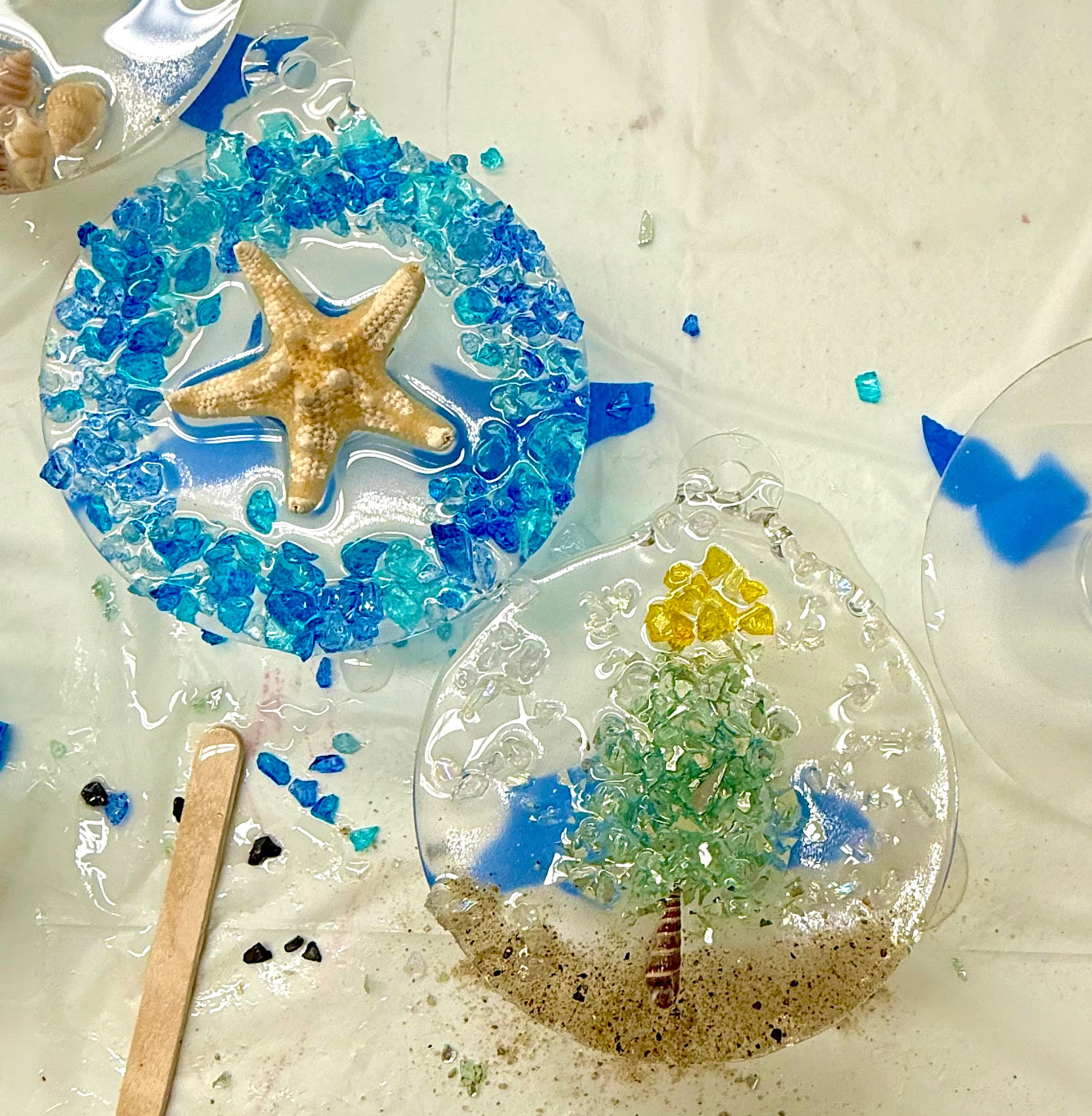 -all of the materials to make your project a success-crushed glass, ornaments, twine, & resin!