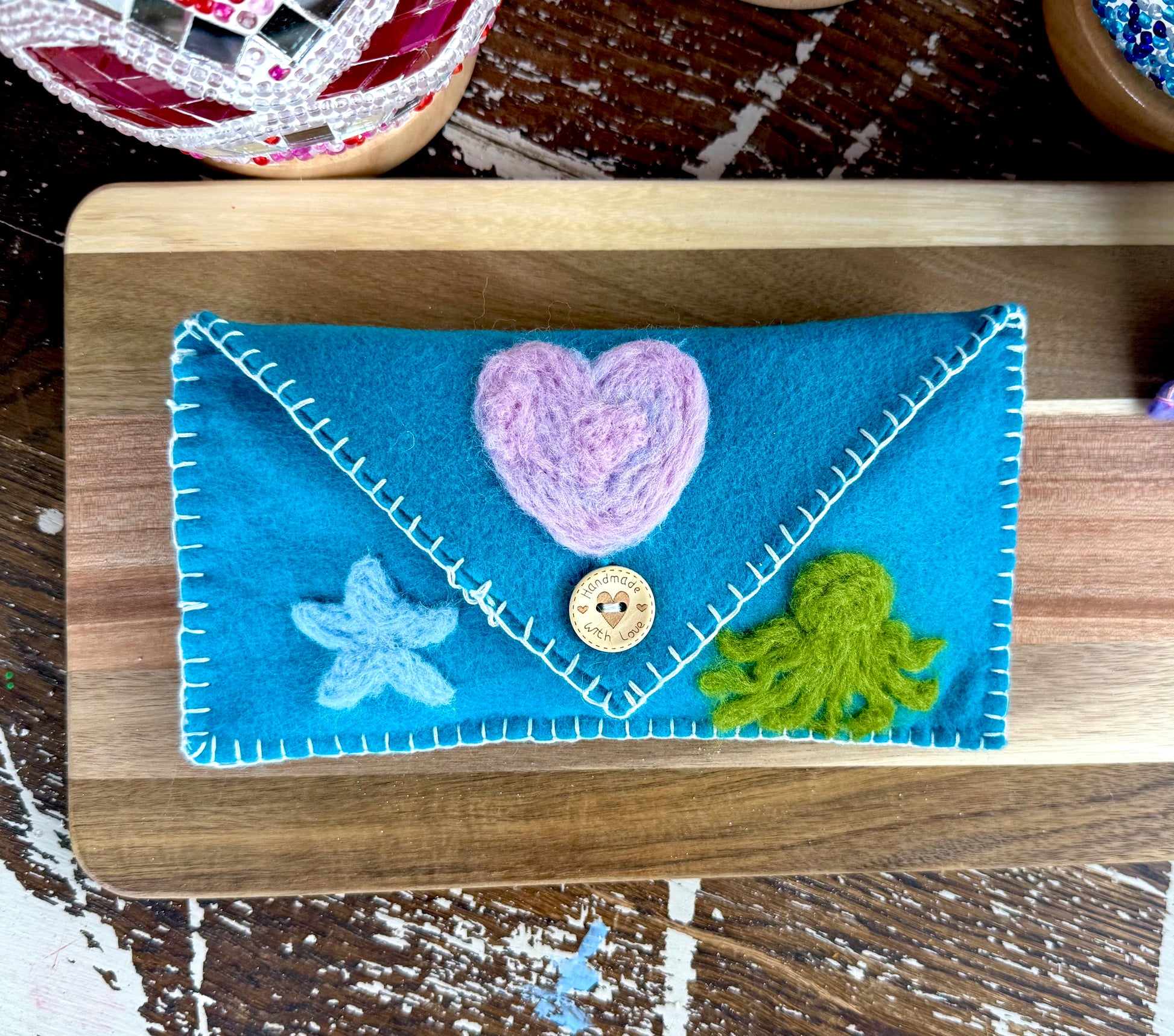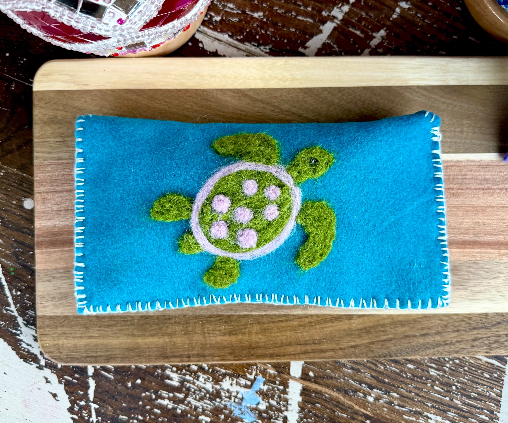 You will learn how to cut the felt, sew it together and create cute needle felted pictures making a beautifully and uniquely designed bag or wallet.