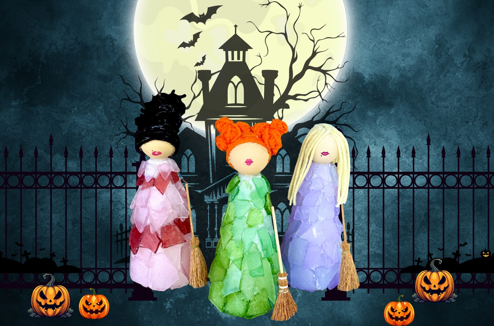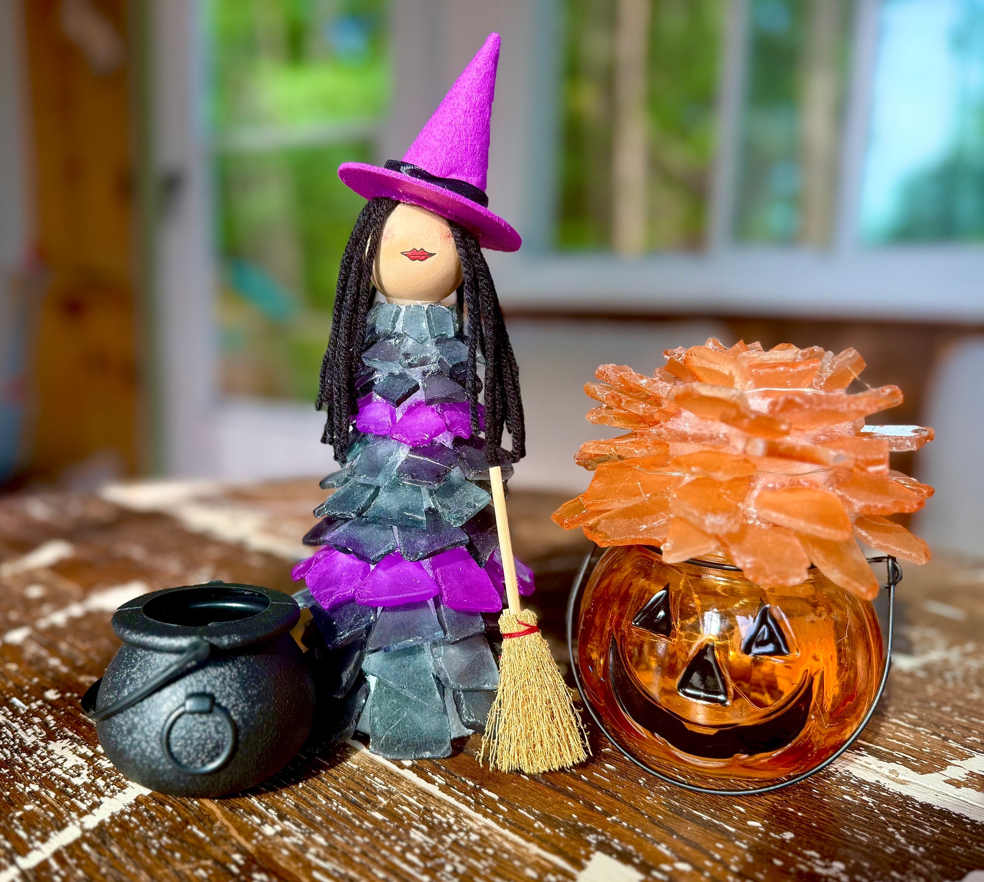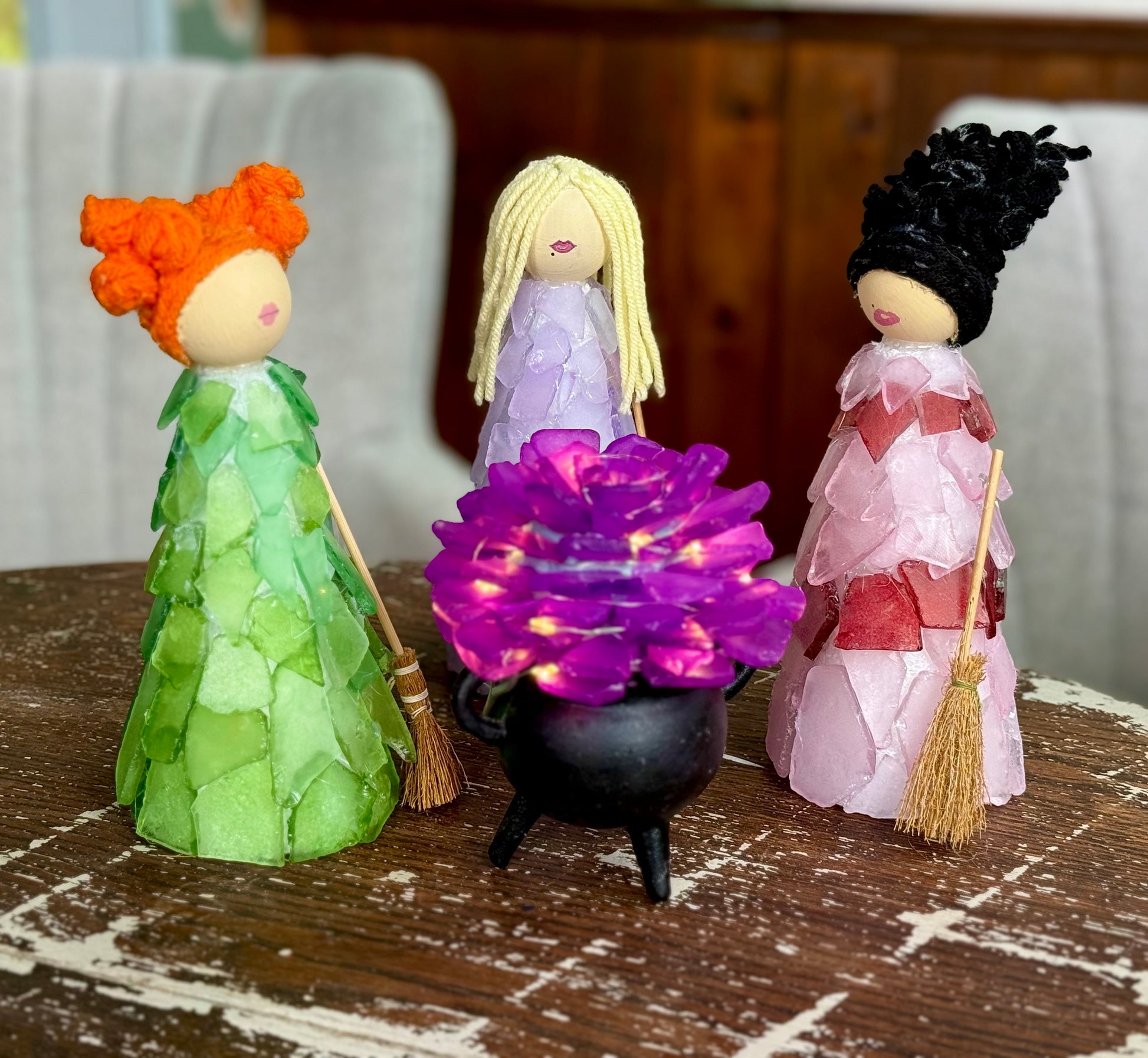 Make light up Sea Glass Sanderson Sisters, a witch, cauldron, or pumpkin succulent in the comfort of your home!!