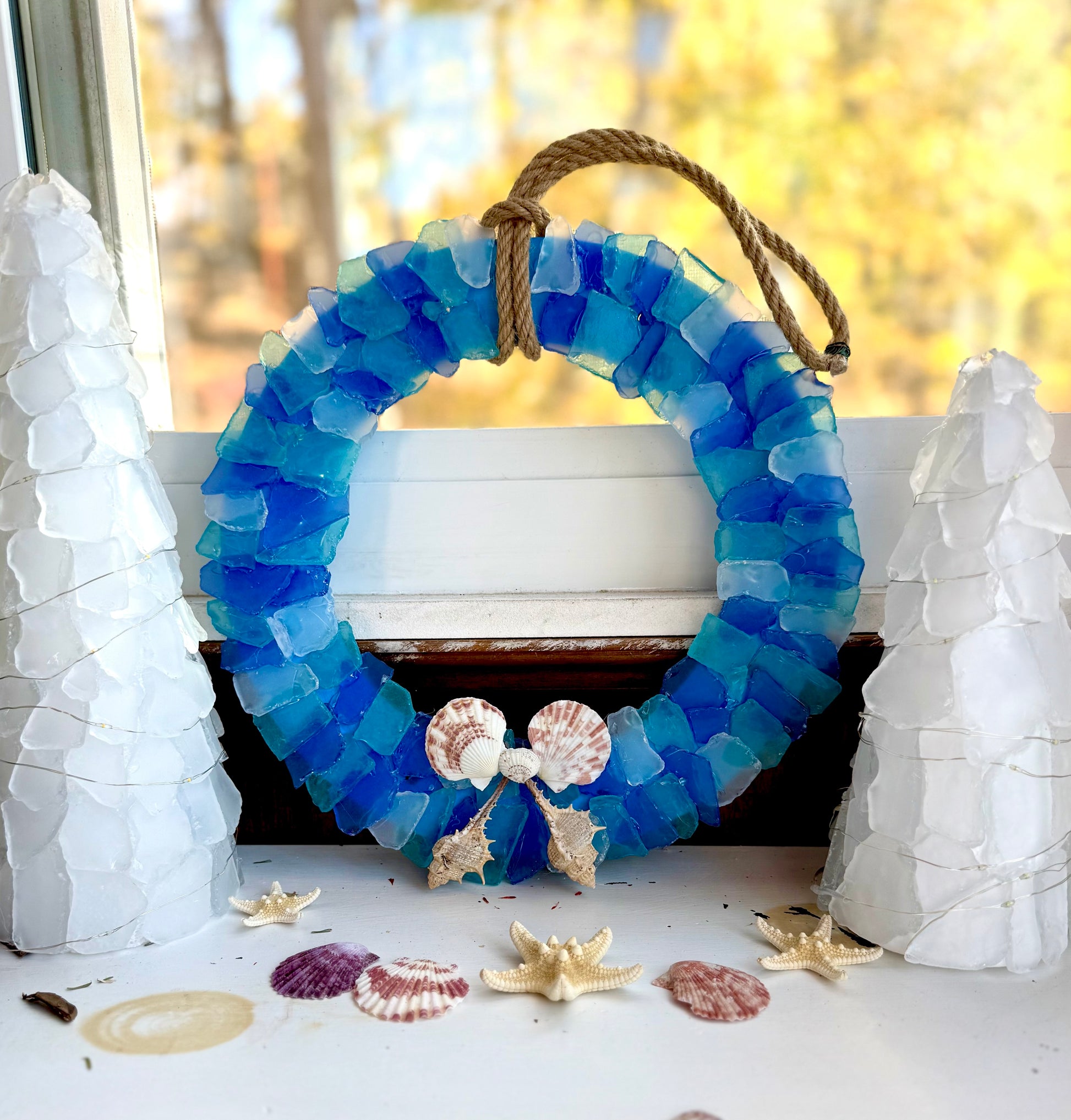 Order one of our beautiful hand-made, stunning tumbled glass wreaths! They will spice up your holiday decor or give one as a gift!